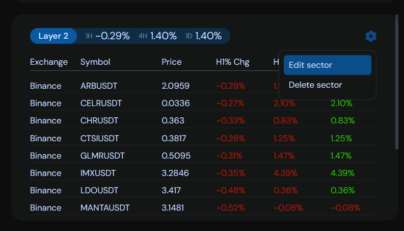2. To edit a sector, click the `⚙️` button on the left side of a sector list and click `Edit sector`. This will take you to a modal where you can rename the sector and add/delete coins. Once done, just click `Edit sector` to save.&#x20;